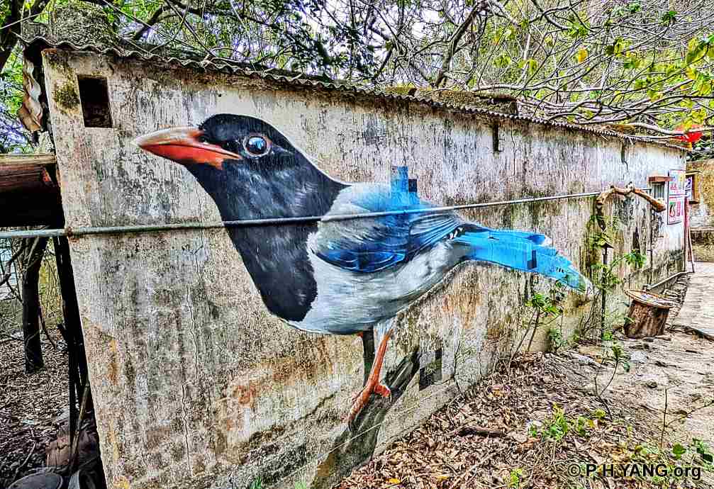mural of a native bird - a Red Billed Blue Magpie on its wall, attracting hikers,