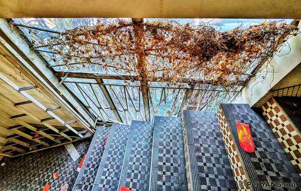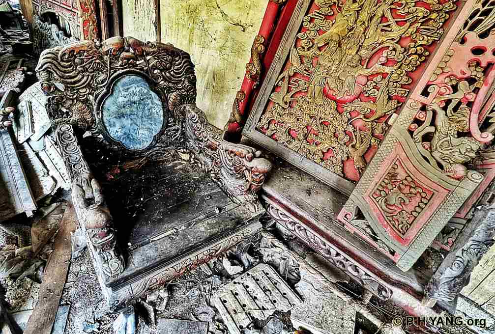 The eaves still retain carved porcelain decorations. Notably, the wooden