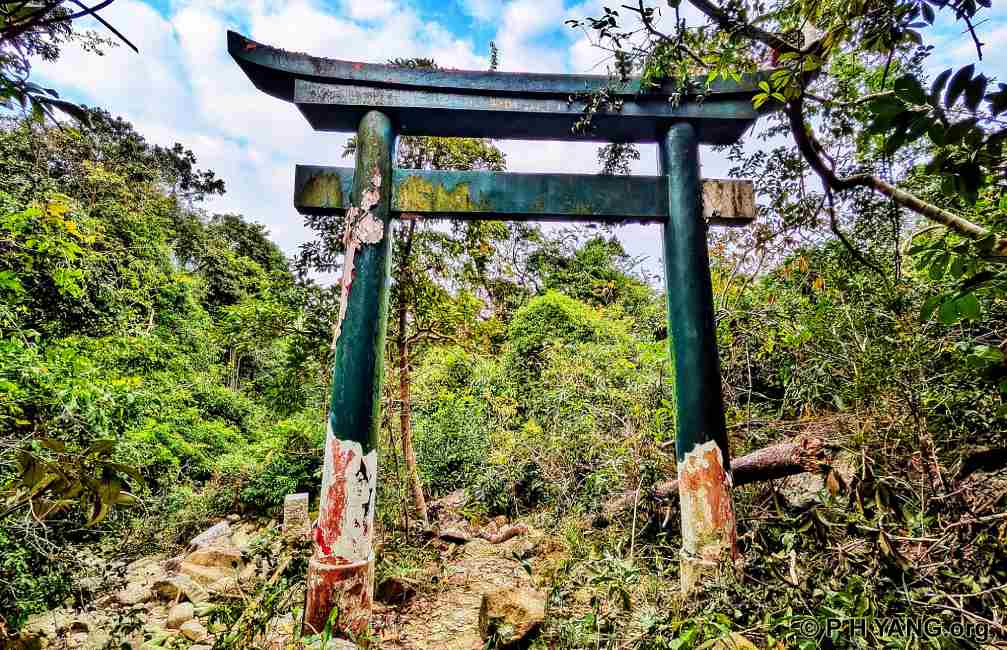 and trees, in the hills. The Torii is painted green on one side and light blue on