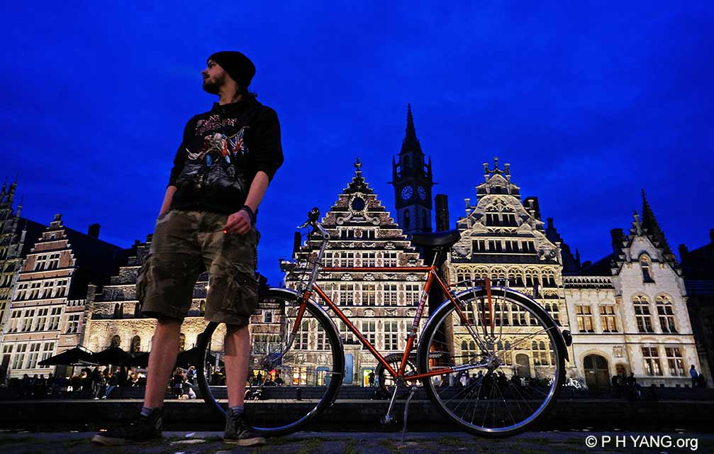 Ingbert likes to bike to the Graslei canal waterfront of Ghent and hangs out