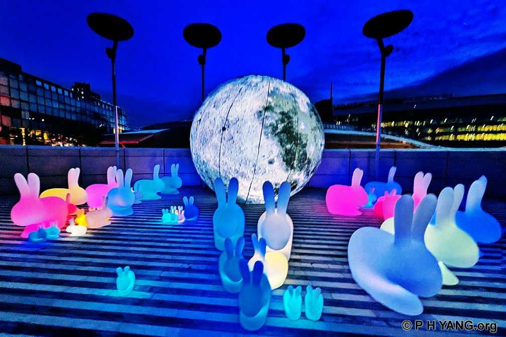 About 200 glowing rabbits, that change colour, with a giant moon are featured