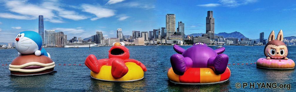 Giant floating inflatable sculptures of Doraemon, KAWS, Sesame Street,